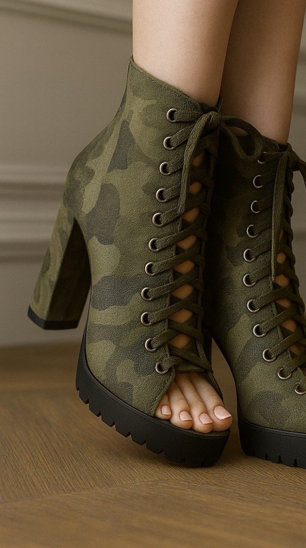 Este calzado fusiona la esencia militar con un glamour indomable, creando un diseño que impone presencia y seguridad en cada paso. Su camuflado sofisticado y su silueta poderosa revelan una actitud que no se esconde: lidera